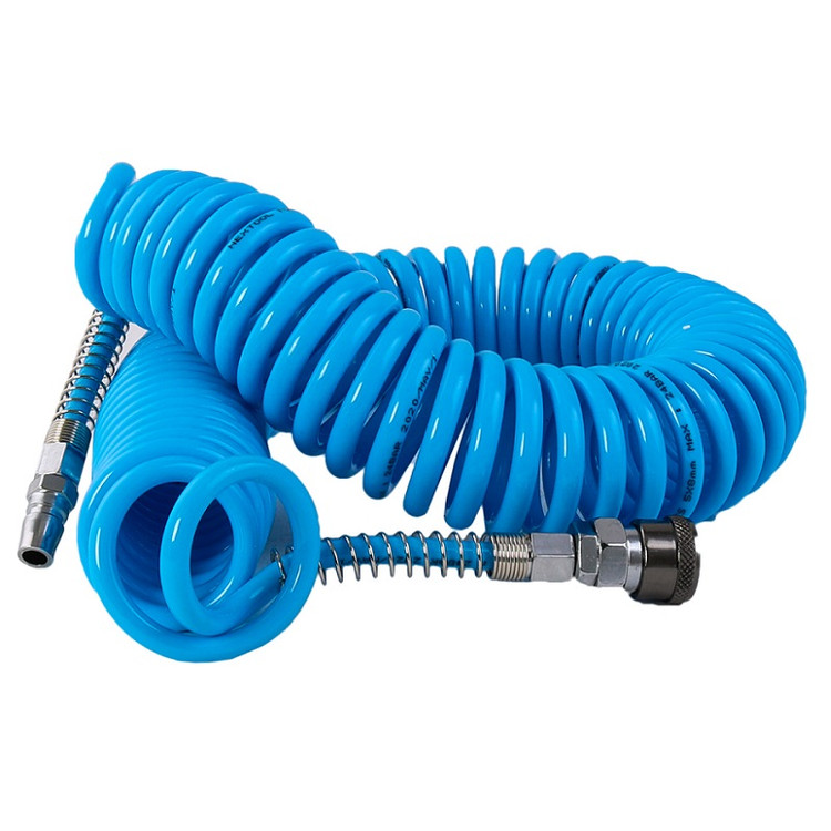شلنگ فنری یک نوع رابط بین منبع باد که غالبا کمپرسور است و ابزار بادی می باشد و این دو را به هم متصل می کند .شلنگ فنری در کارگاه های صنایع چوب ، مکانیکی ها در خطوط مونتاژ کارخانجات و هر جایی که یک ابزار بادی به کار می رود،یافت می شود جنس این شلنگ از مواد اولیه پلی یورتان (PU) است .طول این شلنگ فنری 15 متر می باشد. قطر داخلی این شلنگ فنری 5 میلی متر و قطر خارجی آن 8 میلیمتر است. حداکثر فشار قابل تحمل این شلنگ 24 بار است . به علت استفاده 100 درصدی از مواد پلی یورتان ، این شلنگ فنری به هیچ عنوان خاصیت فنری خود را از دست نمیدهد و از حالت فنری بودن خود خارج نمیشود . در انتهای این شلنگ یه عدد کوپلینگ اتصال با کیفیت با مارک تانوس و در سر دیگر این شلنگ یک عدد دنباله اتصال نصب شده تا براحتی بتوان از این ابزار استفاده نمود . همچنین در قسمت اتصال این کوپلینگها و دنبالهها نیر از فنر مقاوم و قابل انعطاف استفاده شده تا از هرگونه آسیب در این قسمت جلوگیری شود و استقامت شلنگ افزایش یابد .