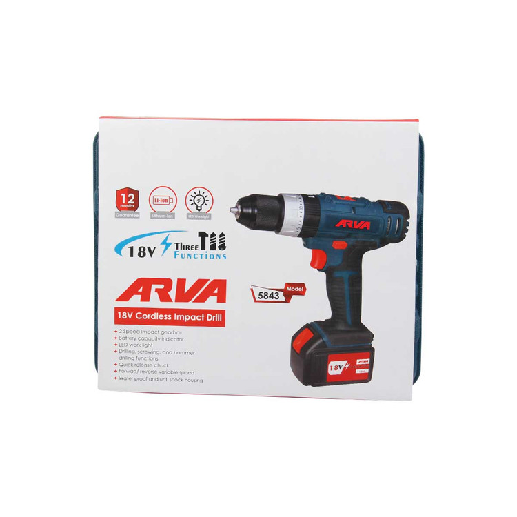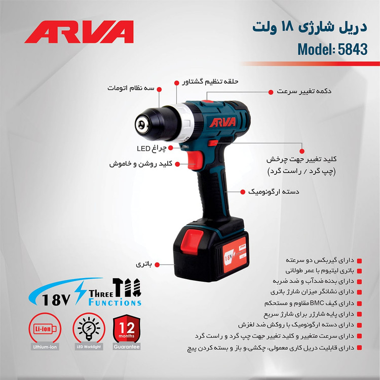 دریل ۱۸ ولت شارژی، دارای سه حالت گیربکس متفاوت، اعم از چکشی، مته و پیچ گوشتی است.